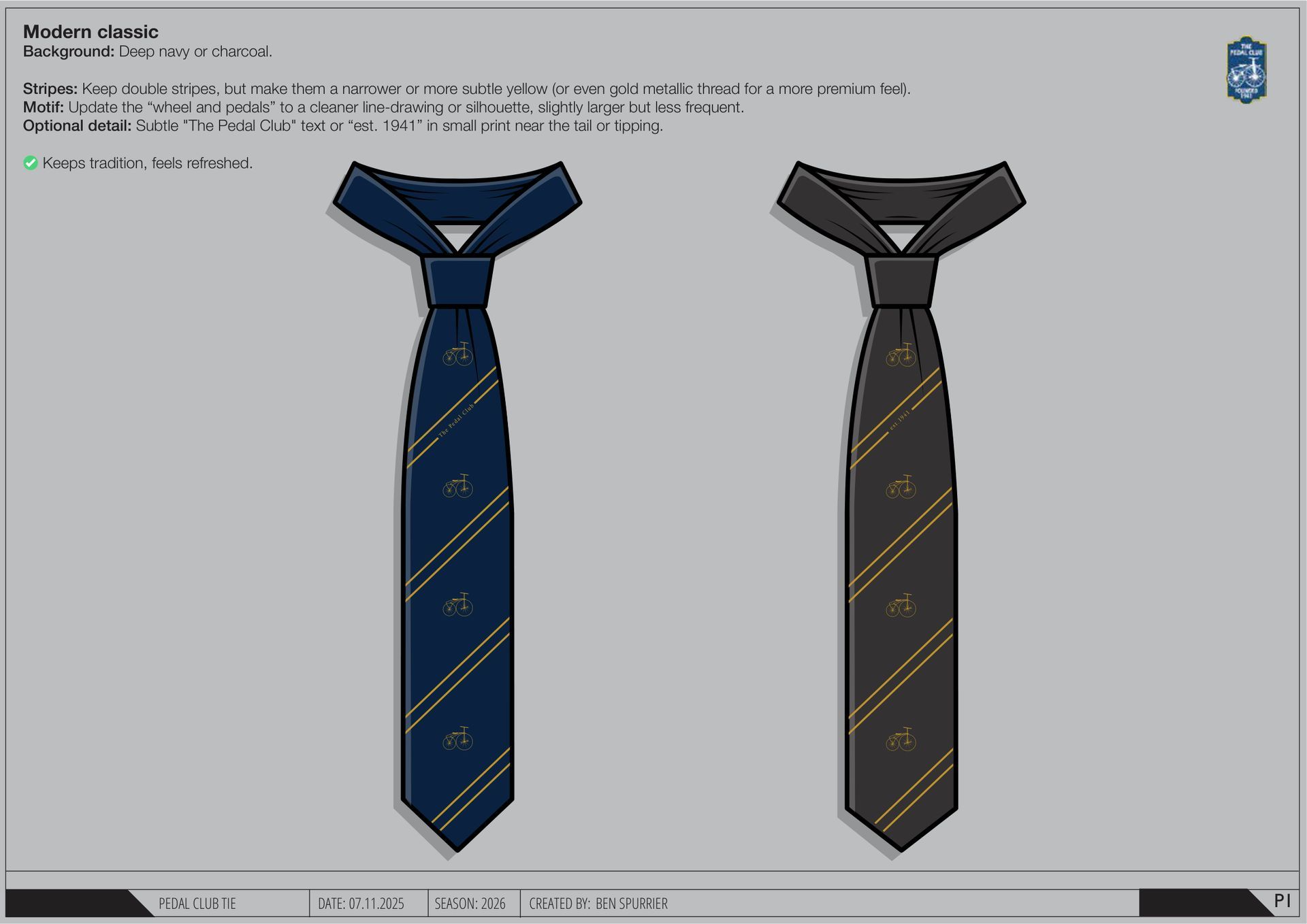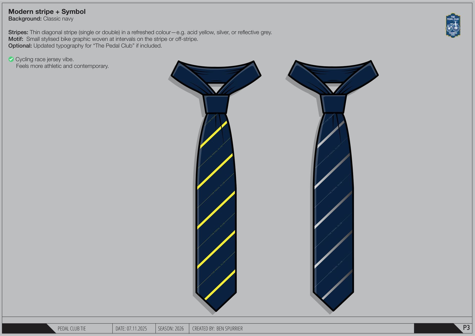 Clean, modern, unmistakably cycling-influenced without looking like old-school regimental or school ties.