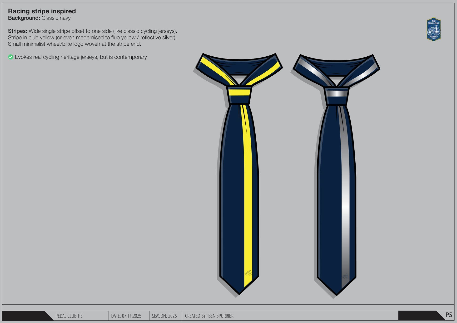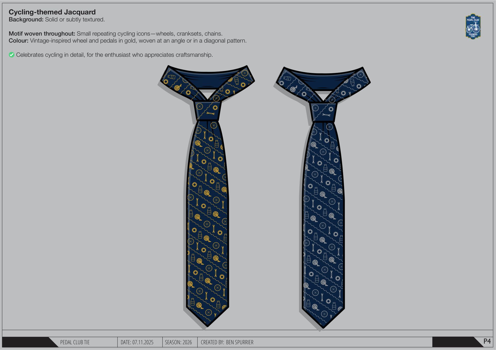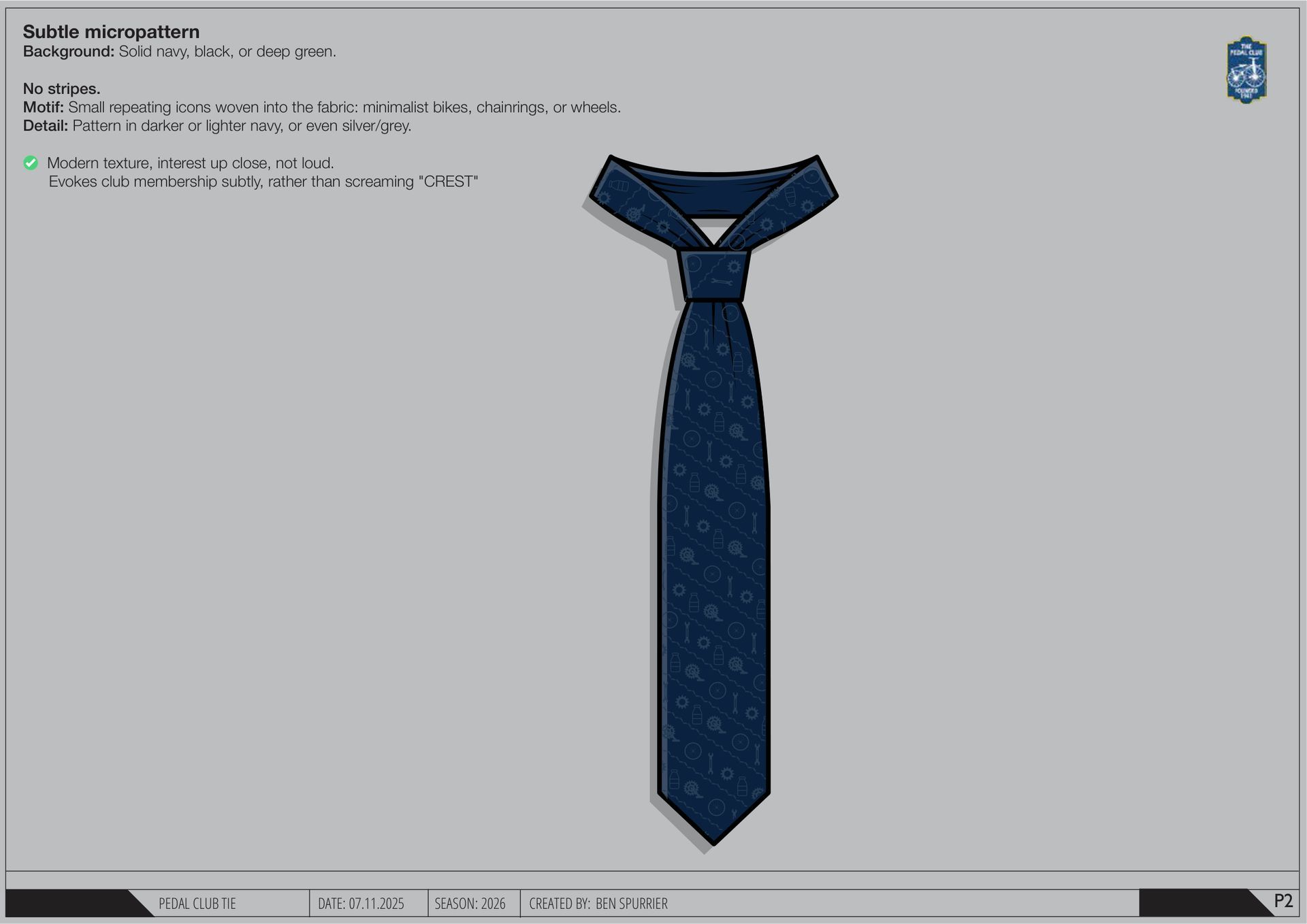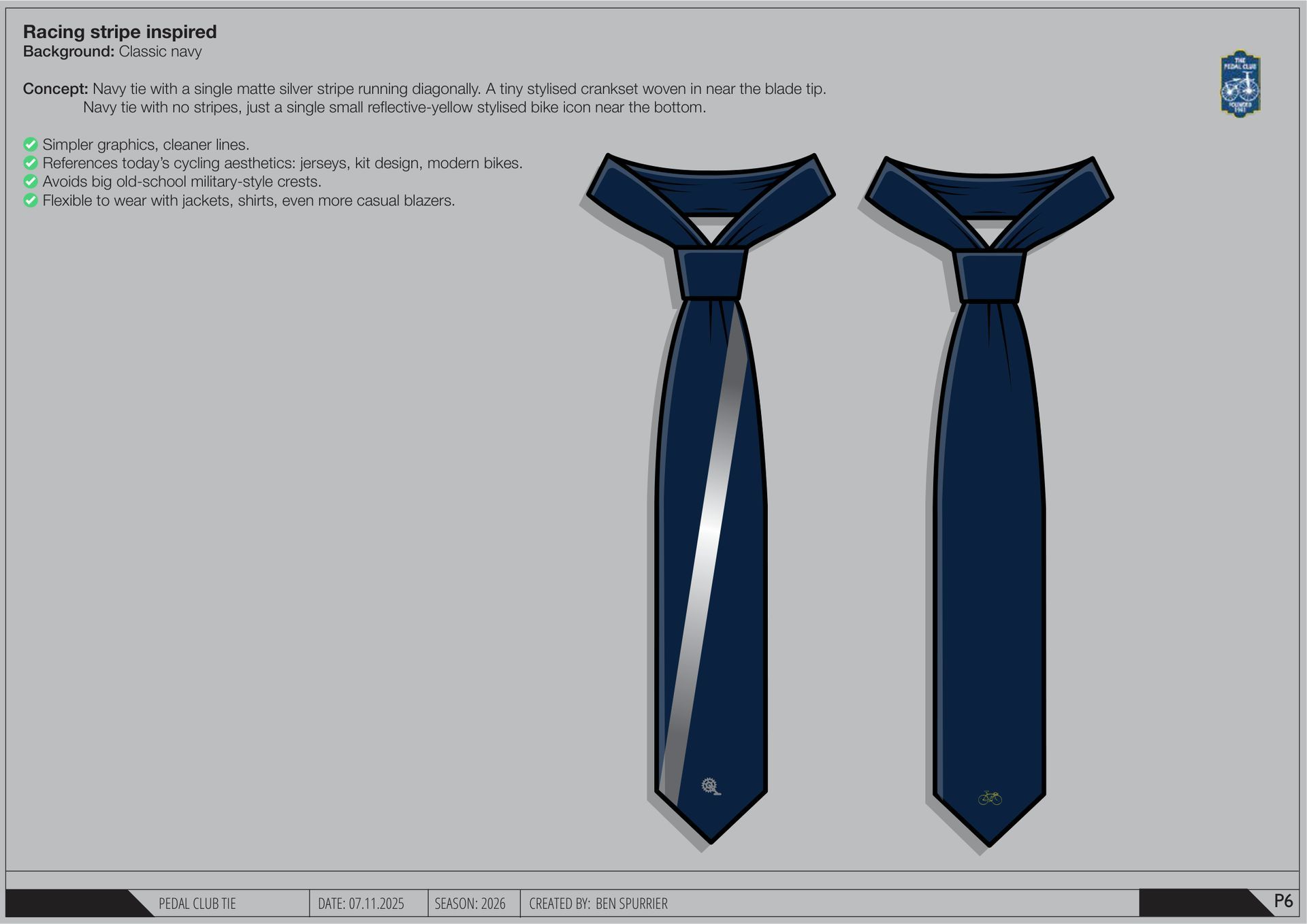 Concept: Navy tie with a single matte silver stripe running diagonally. A tiny stylised crankset woven in near the blade tip.