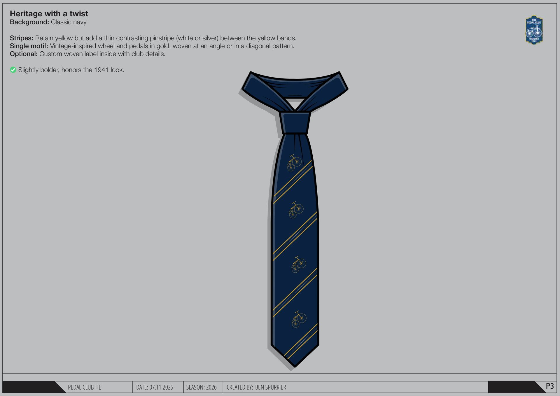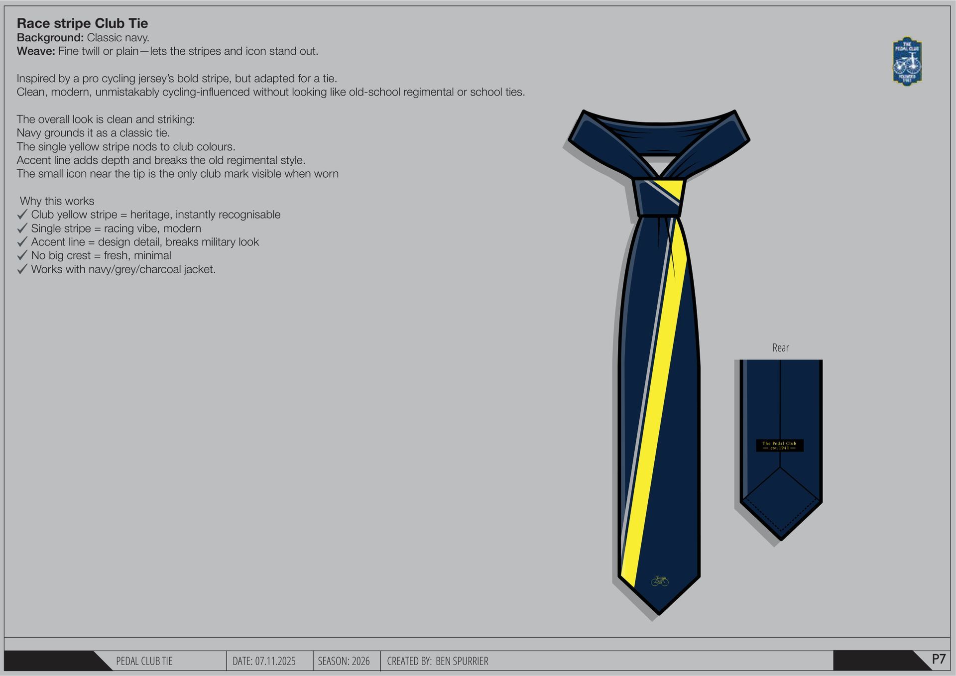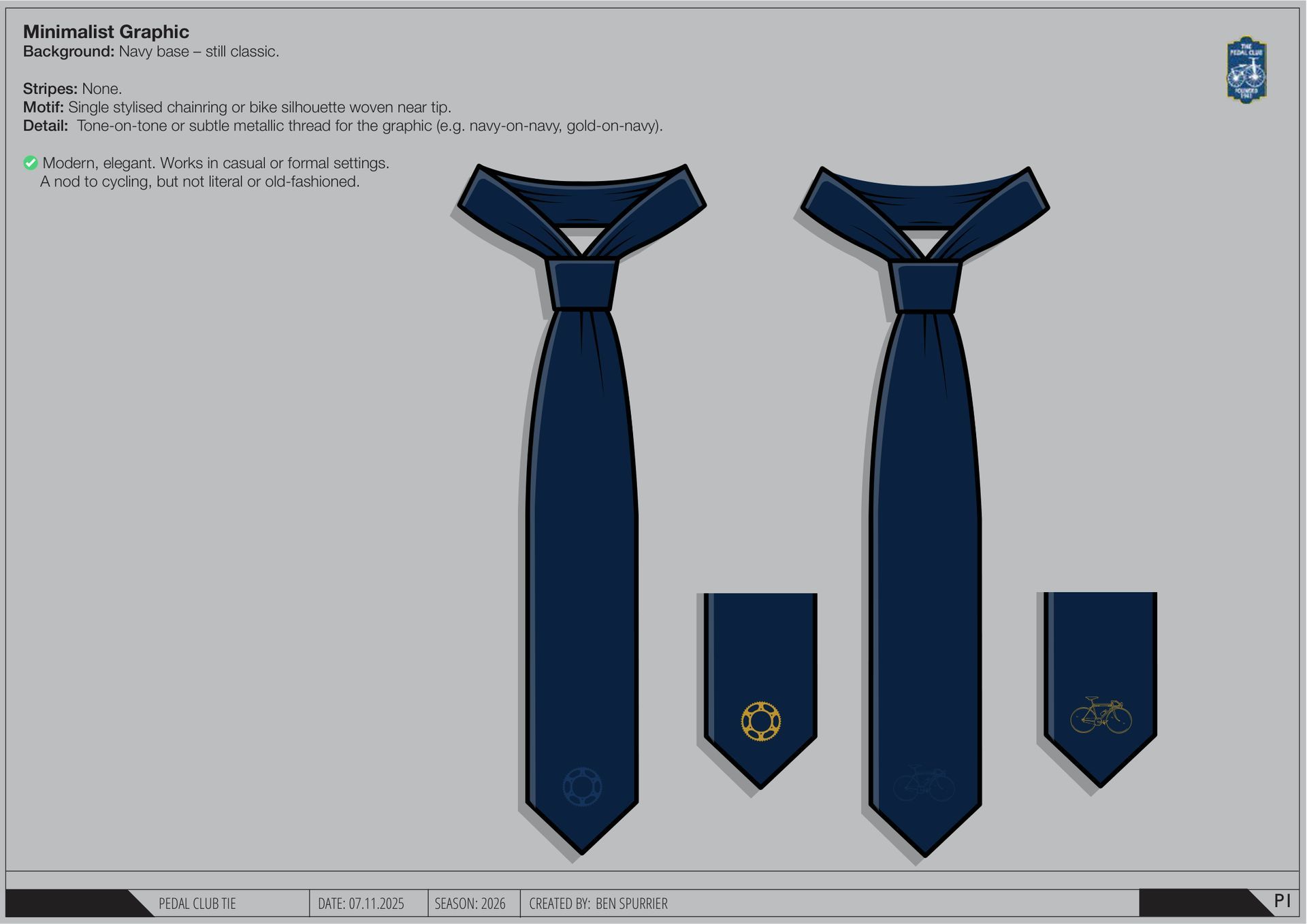 Concept: Navy tie with a single matte silver stripe running diagonally. A tiny stylised crankset woven in near the blade tip.