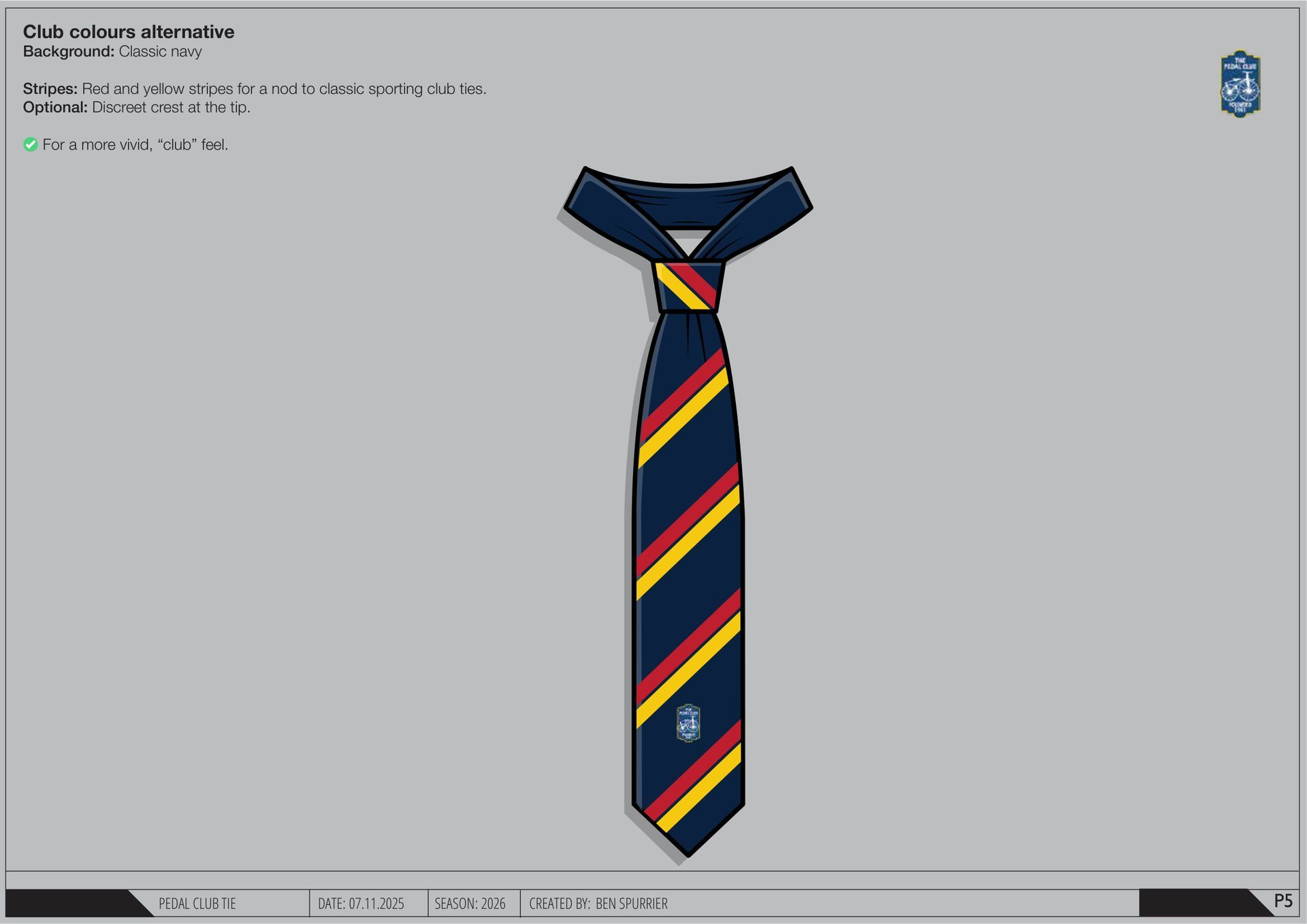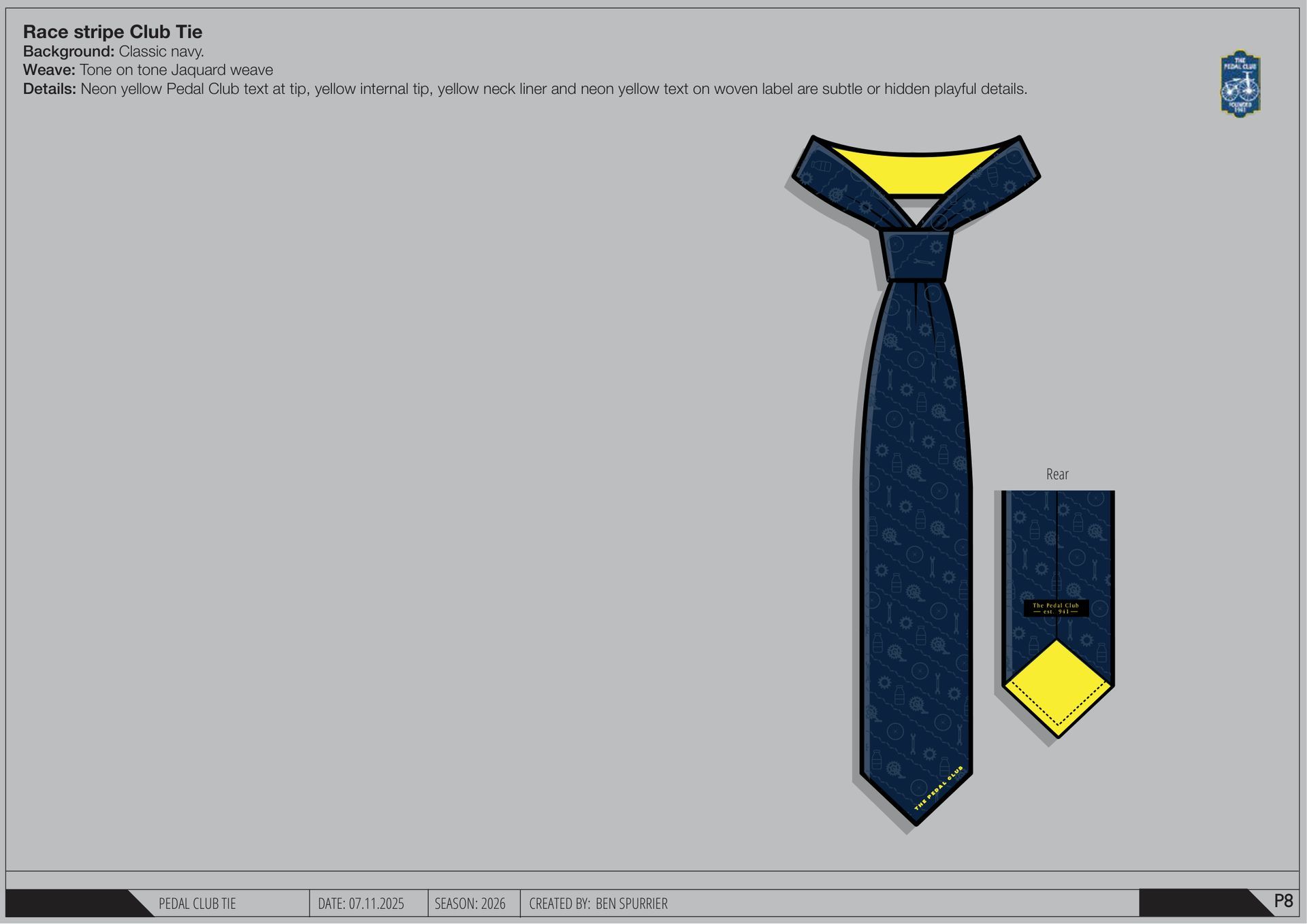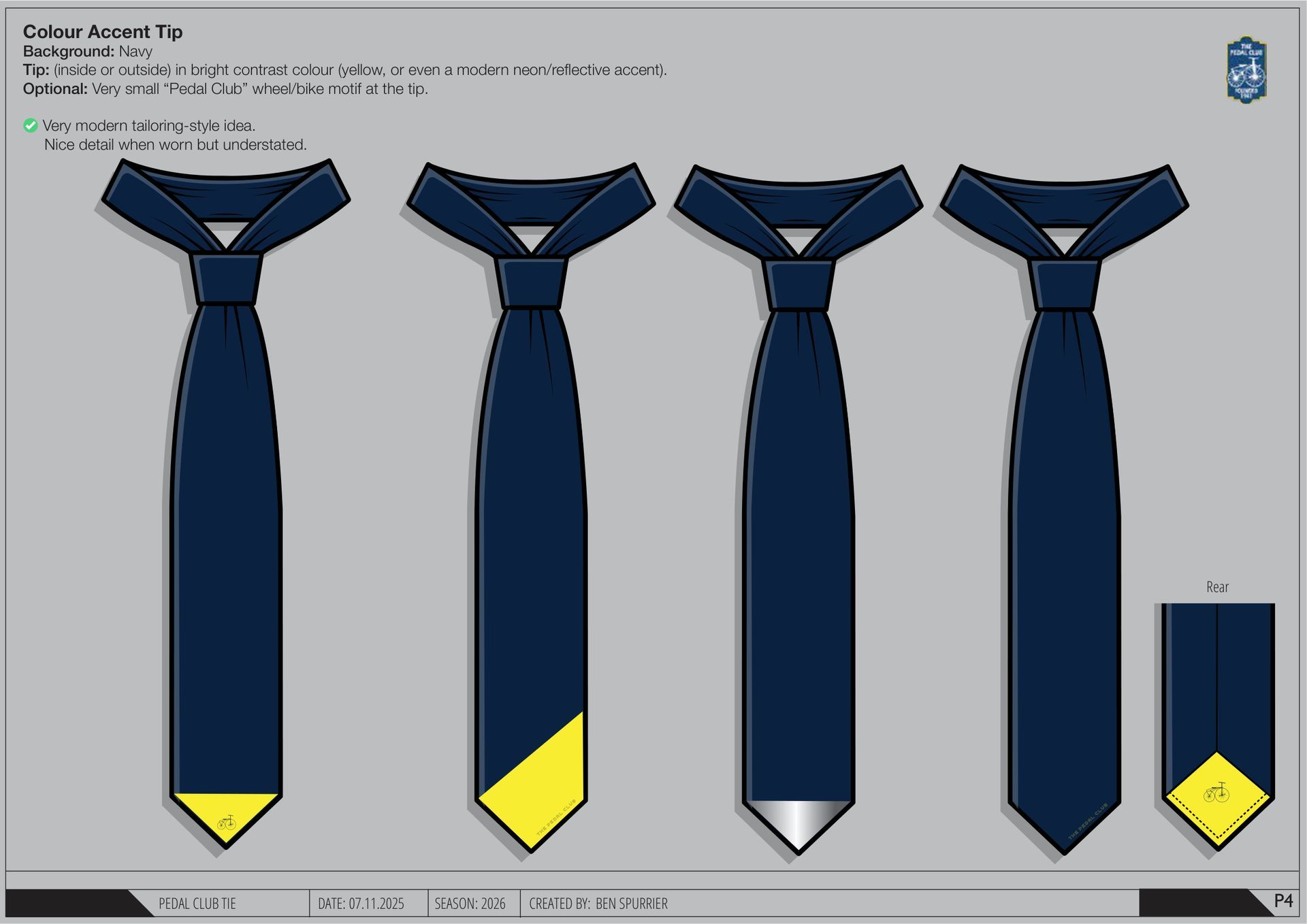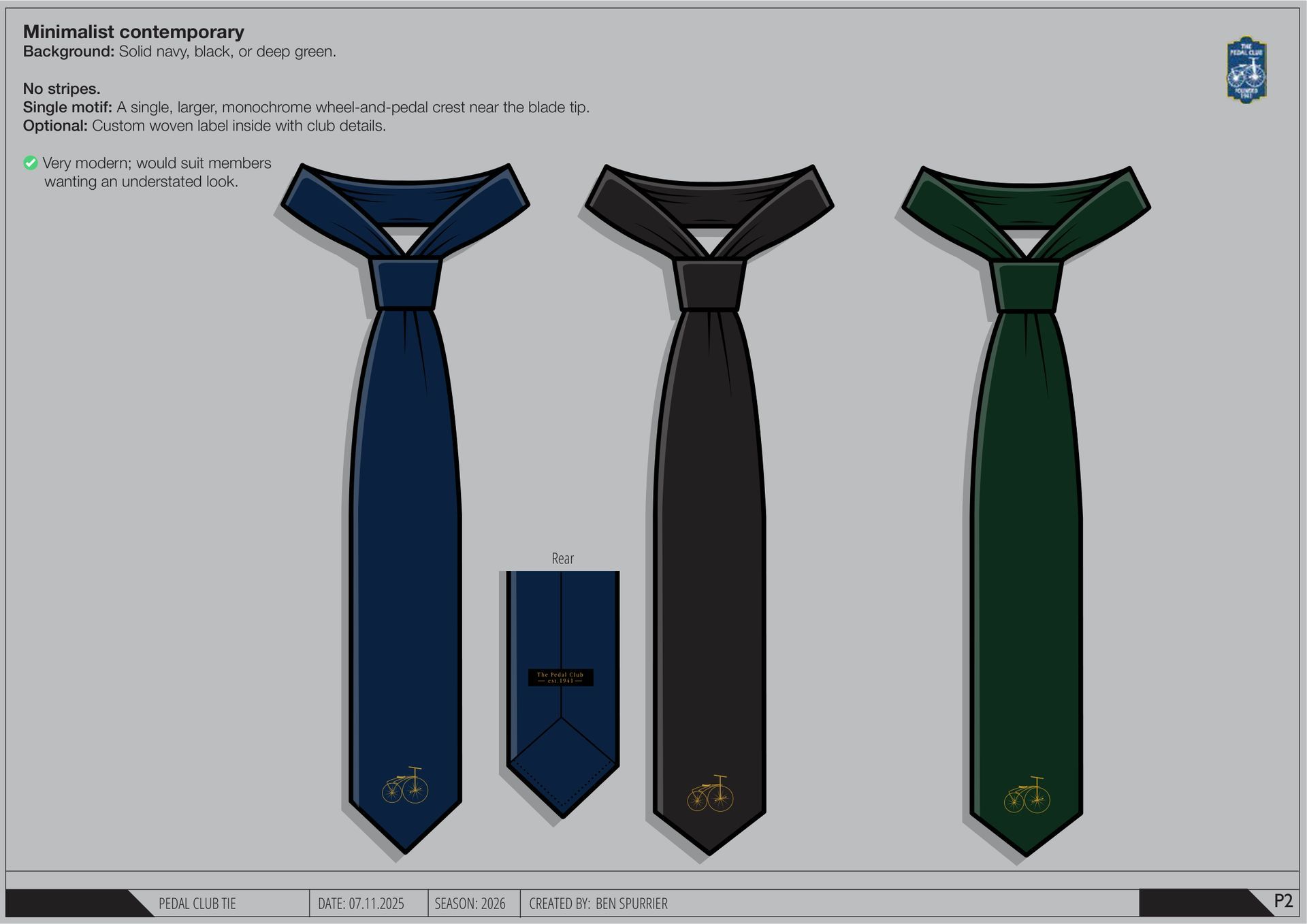 Concept: Navy tie with a single matte silver stripe running diagonally. A tiny stylised crankset woven in near the blade tip.