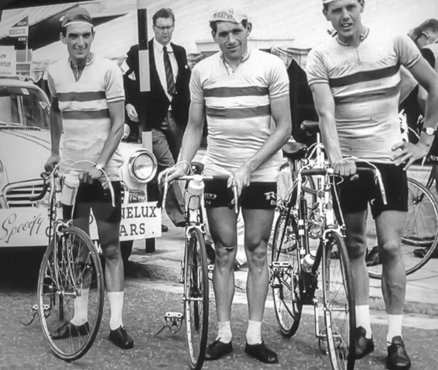 The Wally Green Cycles team in the 1959 Tour of Britain included Trevor Smith on the left, Johnny in the middle and Frank Ward.